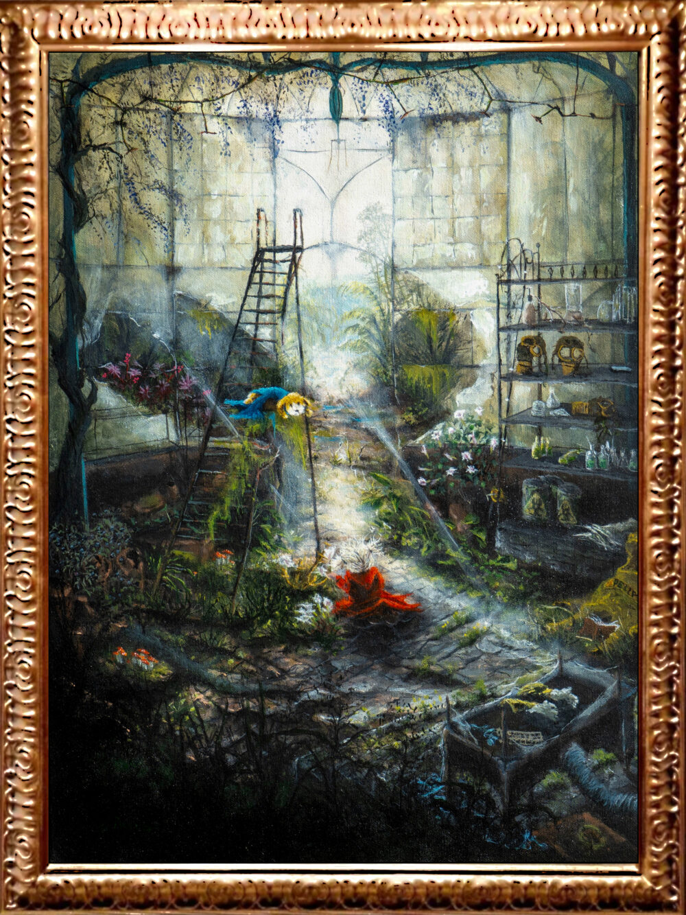 Die Pflanzen wirken nicht dekorativ, sondern bedrohlich. Form, Farbe und Wuchs erinnern an toxische oder alchemistisch genutzte Gewächse (Anmutungen von Tollkirsche, Bilsenkraut, Stechapfel oder experimentell veränderten Pflanzen). Natur erscheint hier als unberechenbare Kraft, nicht als Idylle.