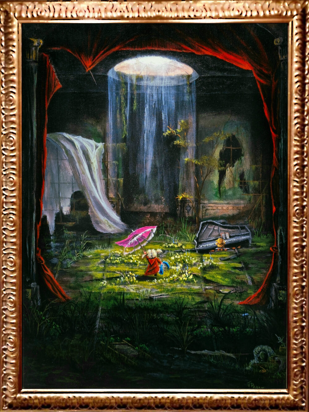Das Werk inszeniert ein poetisches Theaterstück ohne Publikum, in dem Tanz und Musik von kindlich-symbolischen Figuren getragen werden. Durch magisch-realistische Verfremdung, expressive Malweise und eine starke Bühnenästhetik entsteht eine zeitlose Bildwelt zwischen Erinnerung, Spiel und innerer Freiheit.